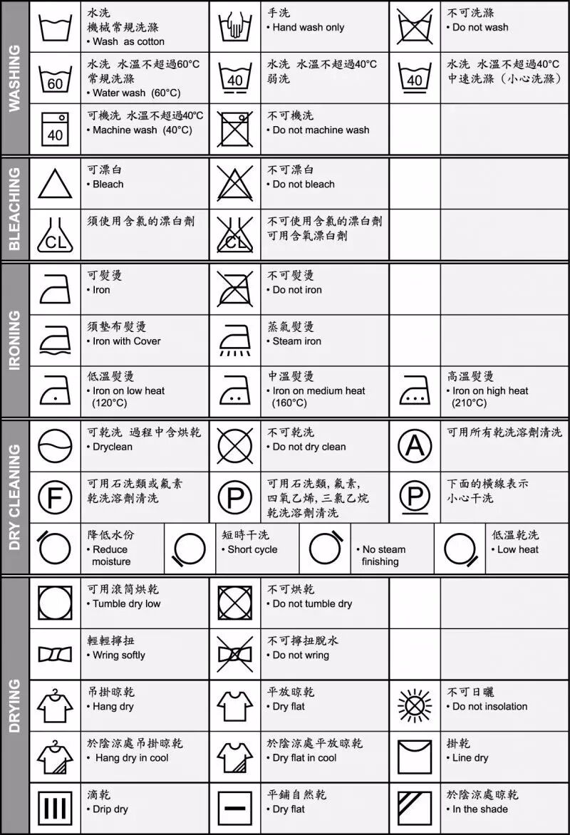 下面這個(gè)圖就是各種圖示的中文對(duì)照版,大家可以參照這個(gè)圖來(lái)保養(yǎng)你們的愛(ài)衣了。