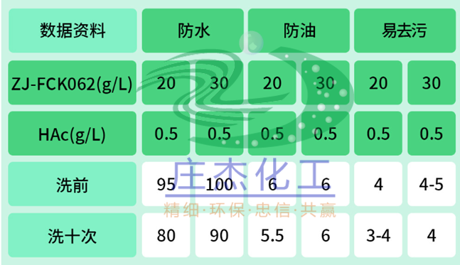 該測(cè)試主要是測(cè)試棉針織平紋布的三防效果,根據(jù)測(cè)試數(shù)據(jù)可得知經(jīng)ZJ-FCK062織物三防易去污整理劑處理后的棉針織平紋布防水5級(jí),防油6級(jí),易去污可達(dá)4-5級(jí);耐洗十次后,處理后的棉針織平紋布防水4級(jí),防油6級(jí),易去污4級(jí)。 通過(guò)洗滌對(duì)比,織物的防油性能不變,其拒水及易去污性能雖有所下降,但幅度不大,仍可滿足易去污要求。織物三防易去污整理劑適用于纖維素纖維,尼龍,滌綸以及它們的混紡織物三防整理上較好地平衡拒污與易去污的矛盾,獲得理想的拒水拒油及易去污整理效果。