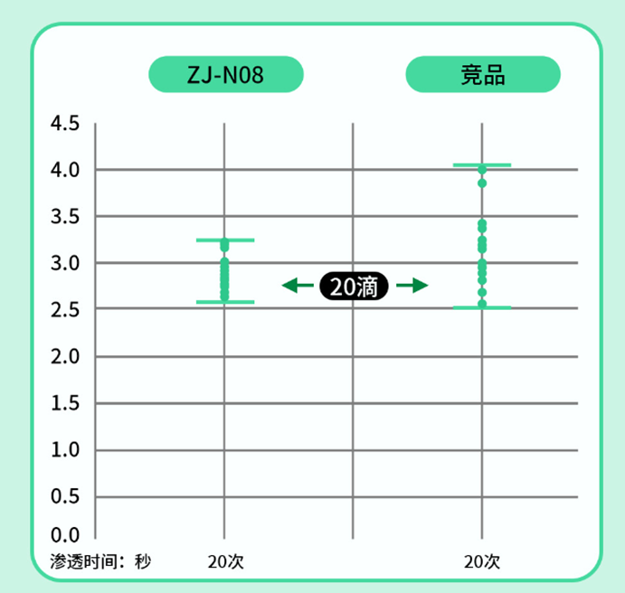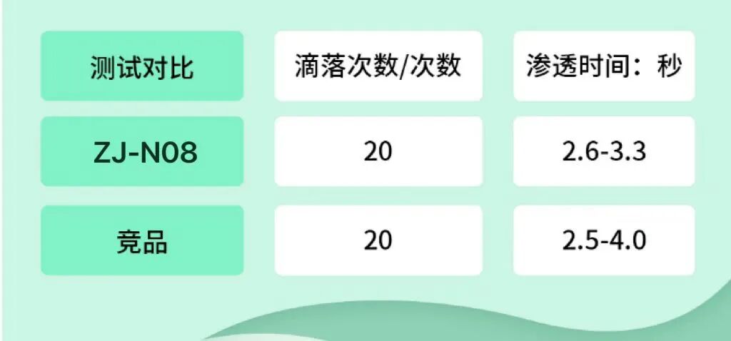 ZJ-N08無紡布親水劑的吸收速度和滲透時間優(yōu)于對比競品,滲透時間在2.6-3.3秒,遠遠低于5s。