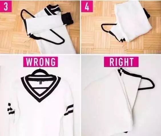 或者在晾曬時用兩個衣架懸掛,以防止因懸掛過重而變形。毛衣晾干后還想繼續(xù)掛著,防止變形可以用這樣的掛式。晾干的衣服對折一下,衣架放置在袖子腋下的位置。