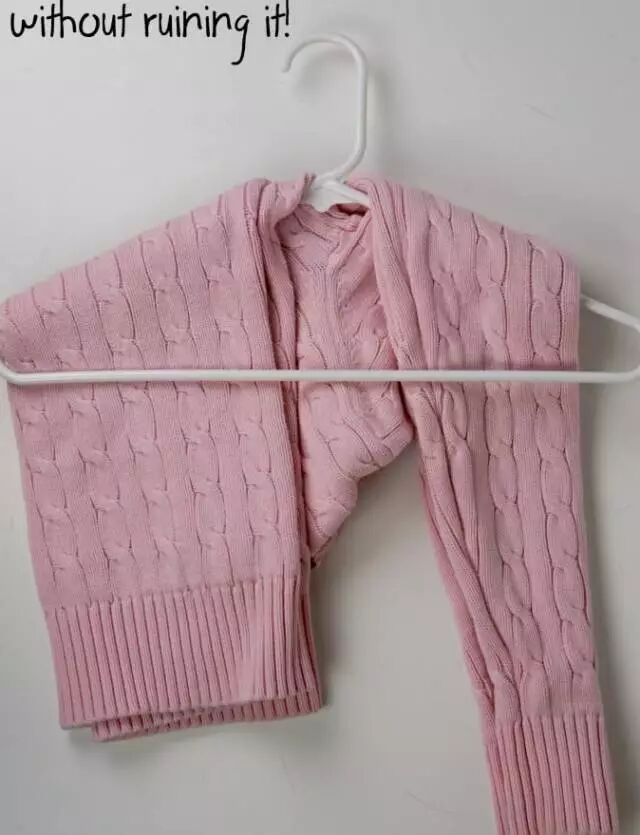 袖子部位從衣架穿過后,再把毛衣下半段穿過。這樣掛起來毛衣不怕肩袖變形,也不容易有折痕啦~